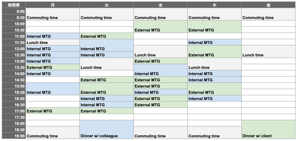 僕は営業という立場上、クライアントとのミーティングをとても重要にしているため、ミーティングも社内か外部かで色分けして管理しています。1週間5営業日として、9時から19時までが仕事の時間だとすると1週間はたった50時間しかなく、上記の例の場合、会社の通勤時間やミーティングの時間、および、ランチタイムを除くと自分が作業できる時間は17.5時間=これが来週の自分の時間的リソースであることに気がつくことができます。