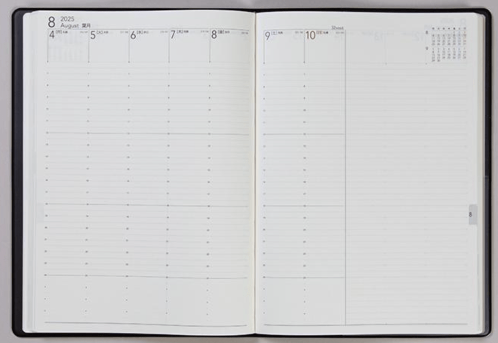 僕は毎週土日のどちらかに必ず30分ほど1週間のスケジュールを計画する時間を設けてます。現在、外資系のビッグテックカンパニーに勤めているのですが、スケジュール管理はアナログで手帳で手書きに拘ってます(理由は後述)。いろいろ試した結果、僕の一番のおすすめの手帳は、高橋書籍の[No.94] デスクダイアリー です。下記が見開きになりますが、毎日を30分刻みで管理することができ、右側の余白でタスクなどのメモも取ることができます。僕は毎週土日のどちらかで、30分刻みで自分のスケジュールと、その1週間で何を成し遂げるかを決めています。